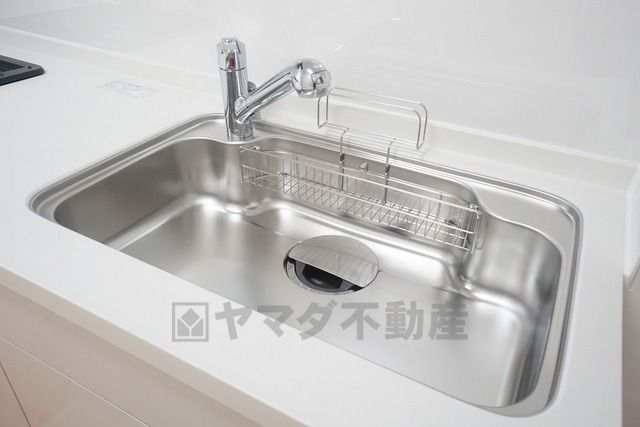 大きなお鍋も楽々洗える幅の広いシンクです^^ステンレスシンクなので簡単にお掃除できますよ。洗剤やスポンジもすっきりできる収納付き。