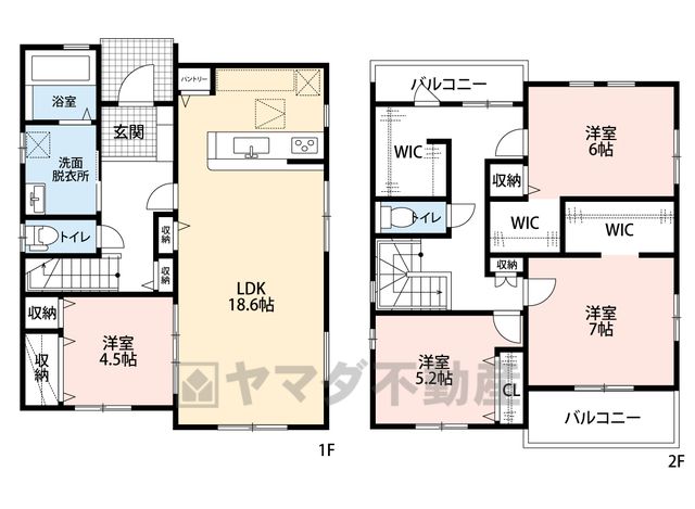 LDK18.6畳(1F)、洋4.5畳(1F)、洋7畳(2F)、洋6畳(2F)、洋5.2畳(2F) |