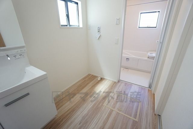 洗面台、洗濯機置き場、バスルームが連なっている、生活導線の考えられた作りになっています。