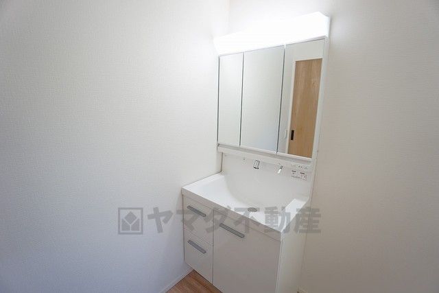 三面鏡にハンドシャワー付きで使いやすい洗面台です^^鏡裏と洗面ボウル下に収納付きの洗面台なので、整理整頓ができスッキリと使えます^^