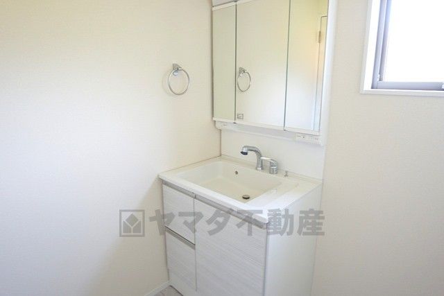 三面鏡にハンドシャワー付きで使いやすい洗面台です^^鏡裏と洗面ボウル下に収納付きの洗面台なので、整理整頓ができスッキリと使えます^^