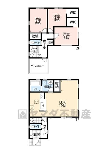 LDK19畳(1F)、洋6畳(2F)、洋5畳(2F) |