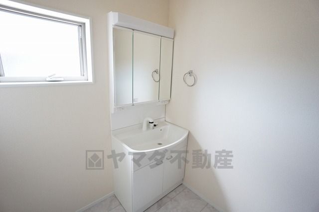 三面鏡にハンドシャワー付きで使いやすい洗面台です^^鏡裏と洗面ボウル下に収納付きの洗面台なので、整理整頓ができスッキリと使えます^^