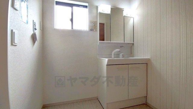 三面鏡にハンドシャワー付きで使いやすい洗面台です^^鏡裏と洗面ボウル下に収納付きの洗面台なので、整理整頓ができスッキリと使えます^^