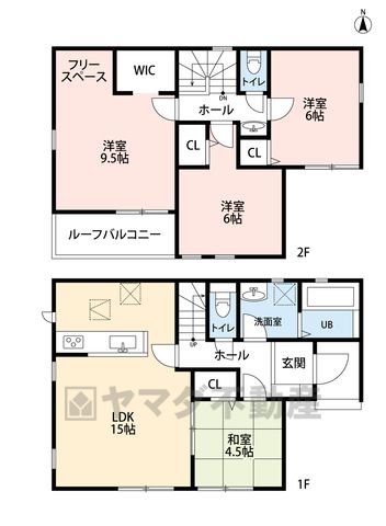 LDK15畳(1F)、和4.5畳(1F)、洋9.5畳(2F)、洋6畳(2F) |