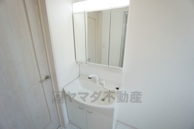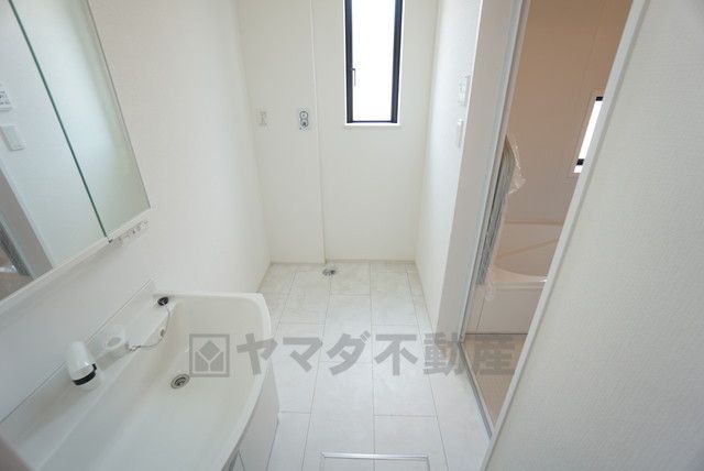 洗面台、洗濯機置き場、バスルームが連なっている、生活導線の考えられた作りになっています。