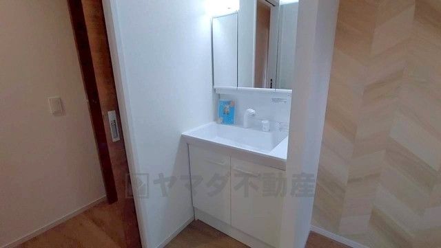 三面鏡にハンドシャワー付きで使いやすい洗面台です^^鏡裏と洗面ボウル下に収納付きの洗面台なので、整理整頓ができスッキリと使えます^^
