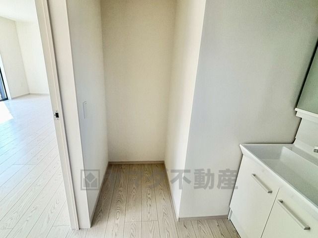 洗面台横にはスペースがあり、棚を設置すればご家族のリネン類や日用品をすっきり収納できそうです。
