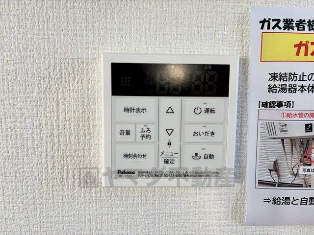 キッチン横からお湯張り、追い炊き、足し湯がボタン一つで楽々操作できる給湯機リモコンです^^忙しい夕飯の準備の時間帯に重宝しますね。