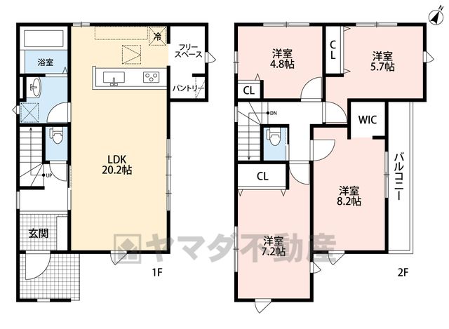 LDK20.2畳(1F)、洋8.2畳(2F)、洋7.2畳(2F)、洋5.7畳(2F)、洋4.8畳(2F) |