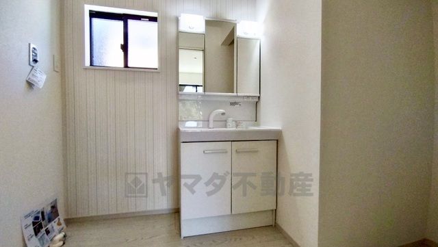 三面鏡にハンドシャワー付きで使いやすい洗面台です^^鏡裏と洗面ボウル下に収納付きの洗面台なので、整理整頓ができスッキリと使えます^^