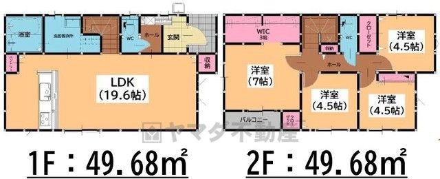 LDK19.6畳(1F)、洋7畳(2F)、洋4.5畳(2F) |