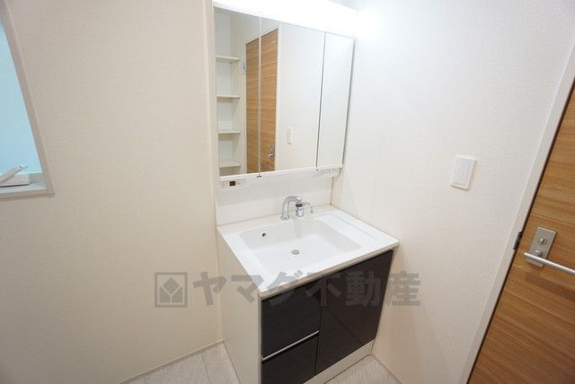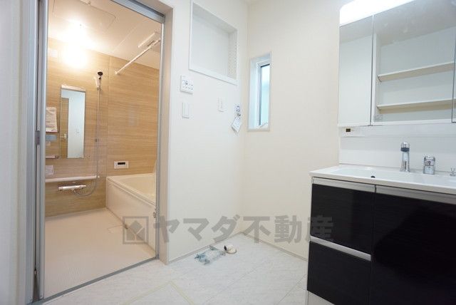 洗面台、洗濯機置き場、バスルームが連なっている、生活導線の考えられた作りになっています。