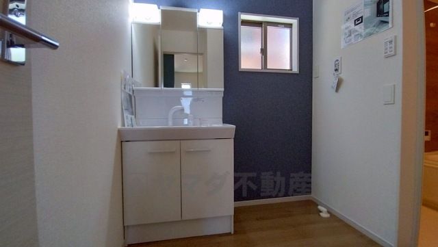 三面鏡にハンドシャワー付きで使いやすい洗面台です^^鏡裏と洗面ボウル下に収納付きの洗面台なので、整理整頓ができスッキリと使えます^^