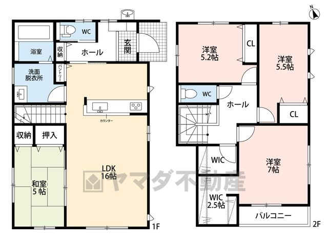 LDK16畳(1F)、和5畳(1F)、洋7畳(2F)、洋5.5畳(2F)、洋5.2畳(2F) |
