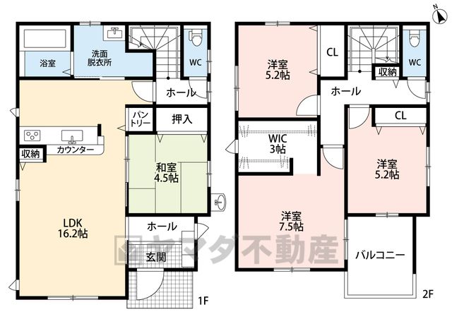 LDK16.2畳(1F)、和4.5畳(1F)、洋7.5畳(2F)、洋5.2畳(2F) |