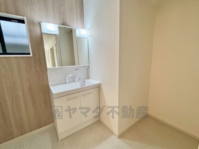 三面鏡にハンドシャワー付きで使いやすい洗面台です^^鏡裏と洗面ボウル下に収納付きの洗面台なので、整理整頓ができスッキリと使えます^^