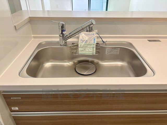 大きなお鍋も楽々洗える幅の広いシンクです^^ステンレスシンクなので簡単にお掃除できますよ。洗剤やスポンジもすっきりできる収納付き。