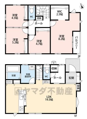 LDK19.5畳(1F)、洋8.2畳(2F)、洋5.2畳(2F)、洋4.7畳(2F)、洋4.5畳(2F) |