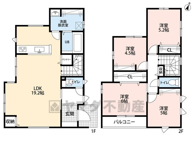 LDK19.2畳(1F)、洋6畳(2F)、洋5.2畳(2F)、洋5畳(2F)、洋4.5畳(2F) |