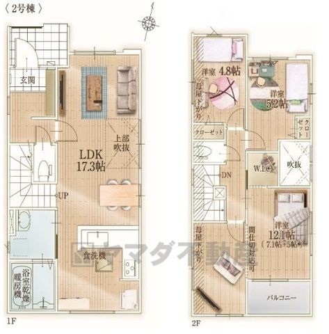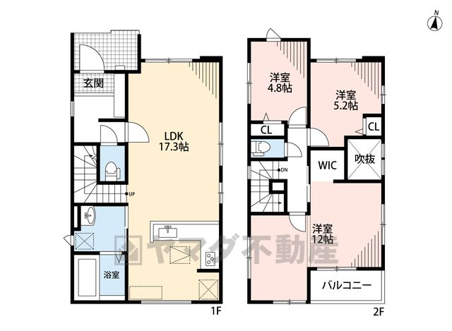 LDK17.3畳(1F)、洋12.1畳(2F)、洋5.2畳(2F)、洋4.8畳(2F) |