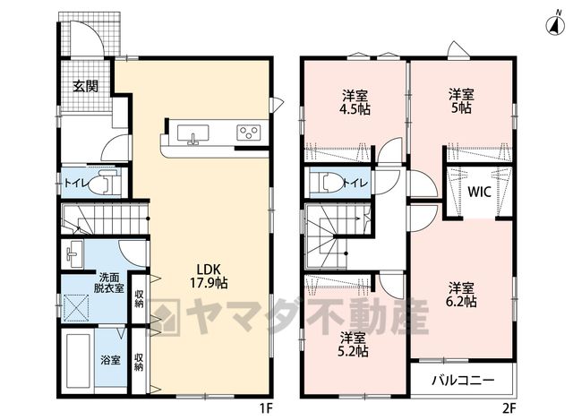 LDK17.9畳(1F)、洋6.2畳(2F)、洋5.2畳(2F)、洋5畳(2F)、洋4.5畳(2F) |