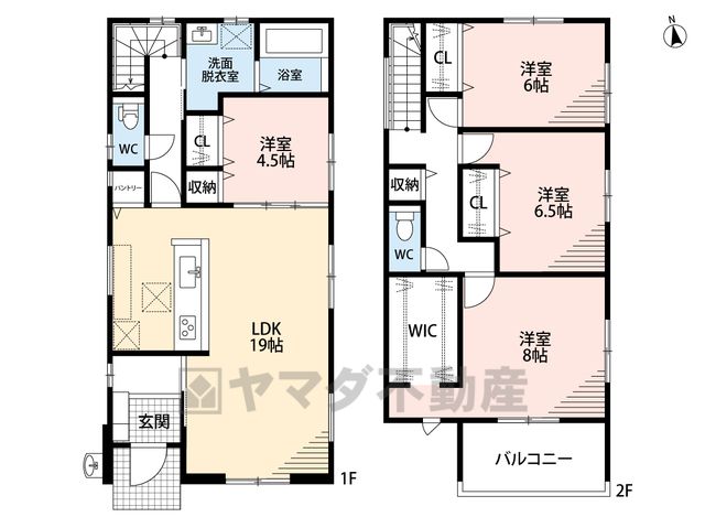LDK19畳(1F)、洋4.5畳(1F)、洋8畳(2F)、洋6.5畳(2F)、洋6畳(2F) |