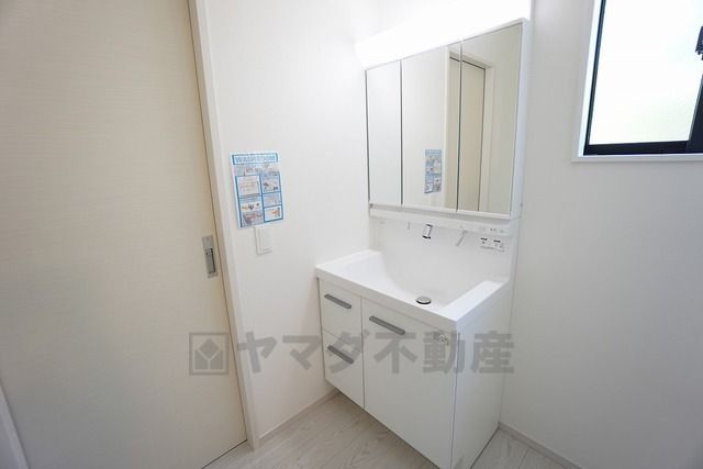 三面鏡にハンドシャワー付きで使いやすい洗面台です^^鏡裏と洗面ボウル下に収納付きの洗面台なので、整理整頓ができスッキリと使えます^^