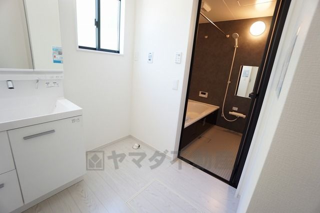 洗面台、洗濯機置き場、バスルームが連なっている、生活導線の考えられた作りになっています。