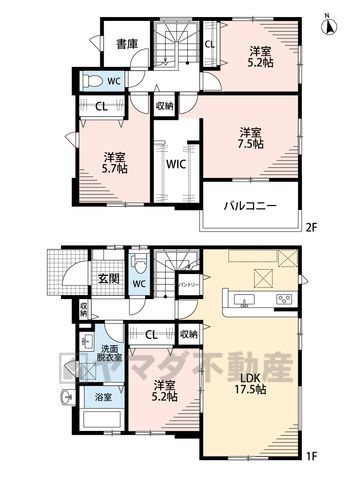 LDK17.5畳(1F)、洋5.2畳(1F)、洋7.5畳(2F)、洋5.7畳(2F)、洋5.2畳(2F) |