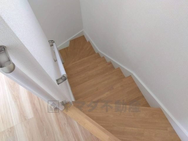 踏み場の広い手摺付き階段です。勾配も緩やかに設計されており、高齢の方でも安心できますね^^