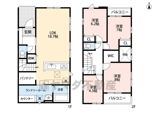 LDK18.7畳(1F)、洋8畳(2F)、洋7畳(2F)、洋6.2畳(2F)、洋4.3畳(2F) |