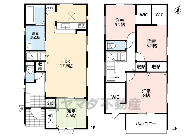 LDK17.6畳(1F)、和4.5畳(1F)、洋8畳(2F)、洋5.2畳(2F) |