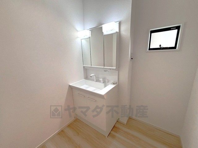 三面鏡にハンドシャワー付きで使いやすい洗面台です^^鏡裏と洗面ボウル下に収納付きの洗面台なので、整理整頓ができスッキリと使えます^^