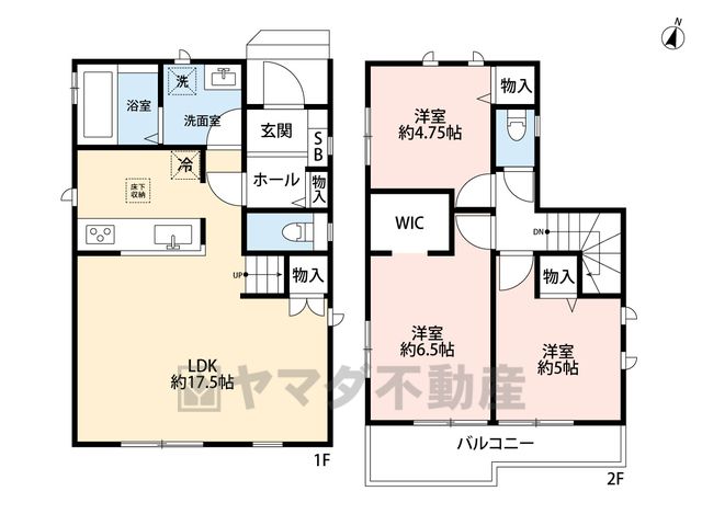 LDK17.5畳(1F)、洋6.5畳(2F)、洋5畳(2F)、洋4.7畳(2F) |