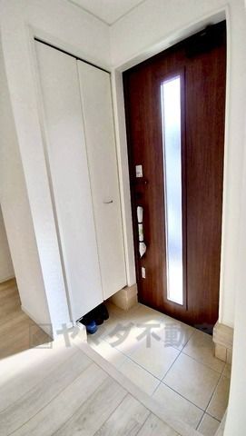 玄関扉から光の差し込む明るい玄関です。たっぷり収納できるシューズボックス付きなので、家族全員の靴がきれいに整頓できます。