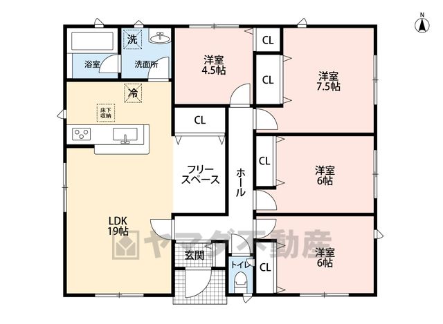 LDK19畳(1F)、洋7.5畳(1F)、洋6畳(1F)、洋4.5畳(1F) |