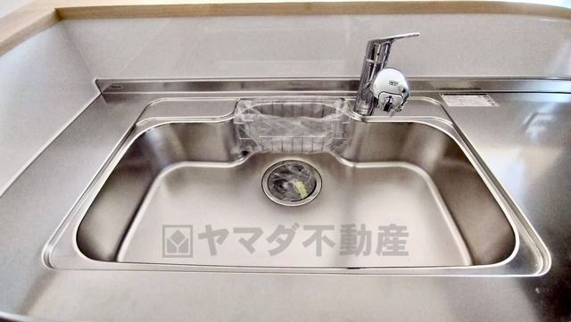 大きなお鍋も楽々洗える幅の広いシンクです^^ステンレスシンクなので簡単にお掃除できますよ。洗剤やスポンジもすっきりできる収納付き。