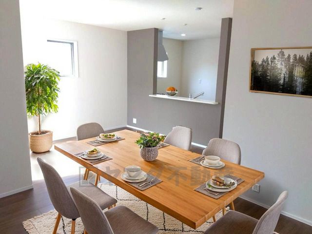 キッチンから会話が弾みそうな。家族が集まる開放的なリビング。約17帖の大空間で毎日のお食事が楽しみです^^思い思いの時間を過ごしたり、家族みんなで食事をしたり、素敵な団らんの場になりますね。