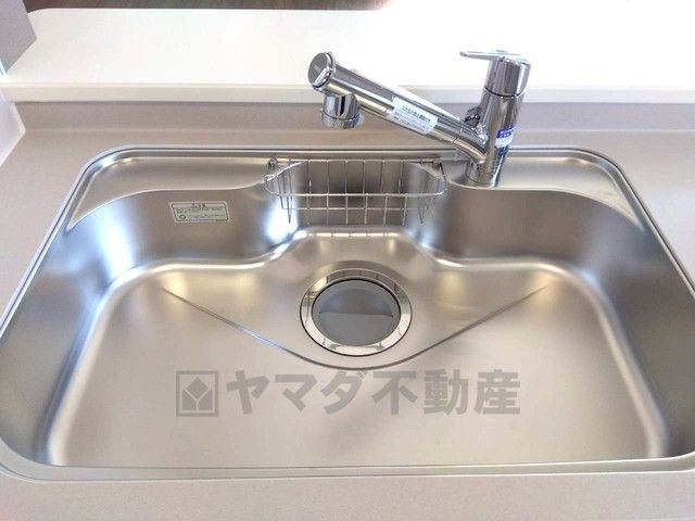 同仕様写真。広々とした凸型シンクに洗剤ポケットを標準装備。大きなお鍋など洗いやすいです。洗剤や石鹸、スポンジもすっきりできる収納付き。