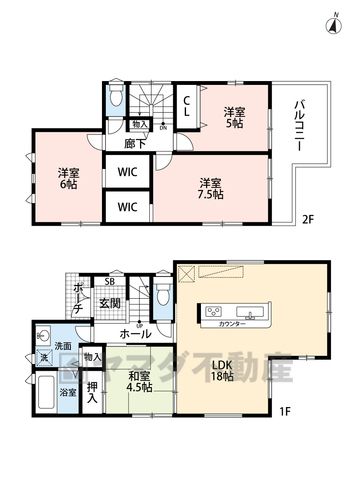 LDK18畳(1F)、和4.5畳(1F)、洋7.5畳(2F)、洋6畳(2F)、洋5畳(2F) |
