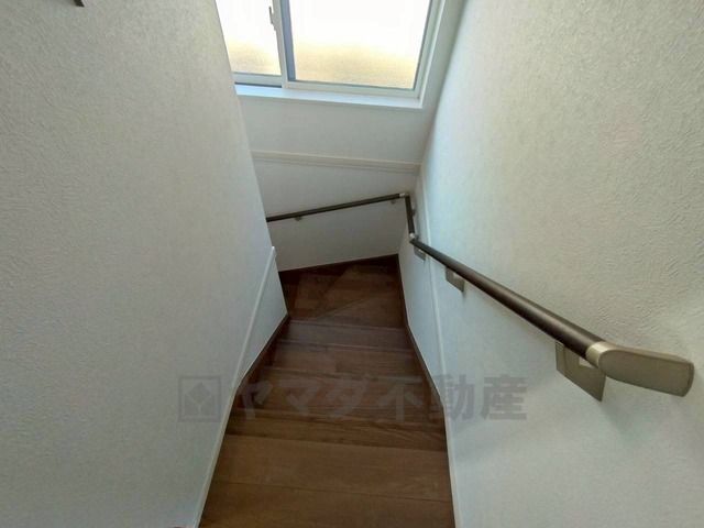 お子様も高齢の方も安心して上り下りができる手摺がついた安心設計です。 階段には小窓を配置しました。日中でも暗くなりがちな階段下が明るくなり安全ですね。