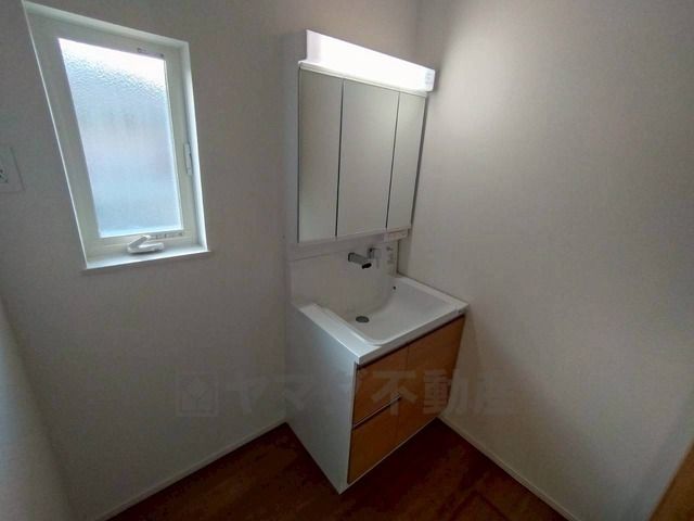 三面鏡裏収納付き洗面化粧台です^^ 歯磨きセットやスキンケア用品などの収納に便利ですね。 生活感も隠すことができ、来客時にも安心です。