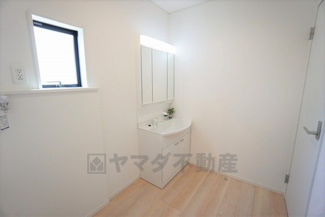 三面鏡つき洗面台。鏡裏にたっぷりとした収納スペースがあります。鏡を閉めてしまえば小物は見えないため、スッキリとした印象の洗面台にできます。
