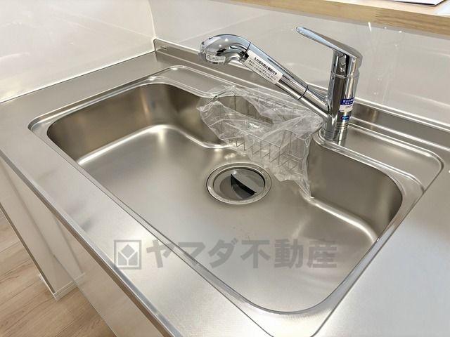 広々としたステンレスシンクには、洗剤やスポンジを収納出来るラック付き。広さも確保しているので、大きなお鍋も洗いやすいです。
