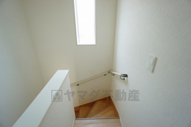 小さなお子様やご高齢の方でも安心できる、手すり付き階段。段差も低めで設定されており、安全性にも優れています。