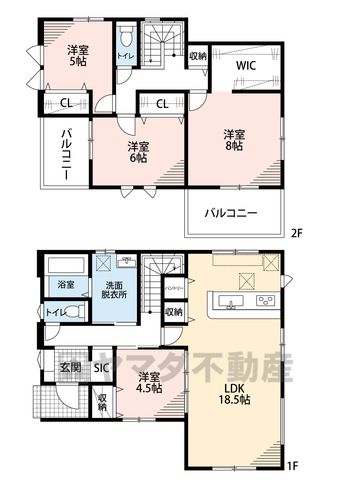LDK18.5畳(1F)、洋4.5畳(1F)、洋8畳(2F)、洋6畳(2F)、洋5畳(2F) |