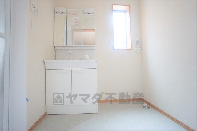 三面鏡つき洗面台。収納も一体型になっているので、ドライヤーやヘアアイロンの置き場に困りませんね。
