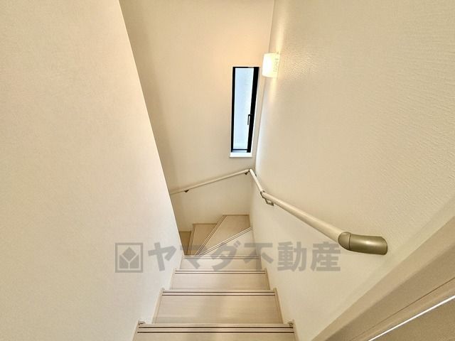 ご年配の方でも安心できる、手すり付き階段です^^段差も低めで設定されてますので安全性にも優れてますね^^