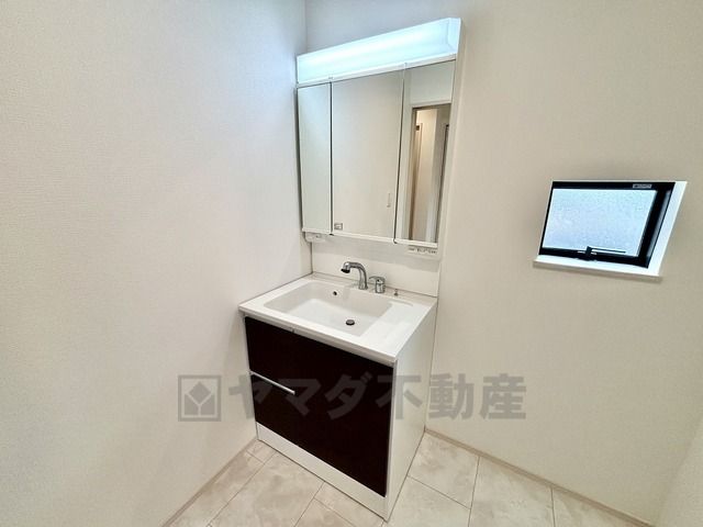 三面鏡つき洗面台。収納も一体型になっているので、ドライヤーやヘアアイロンの置き場に困りませんね。